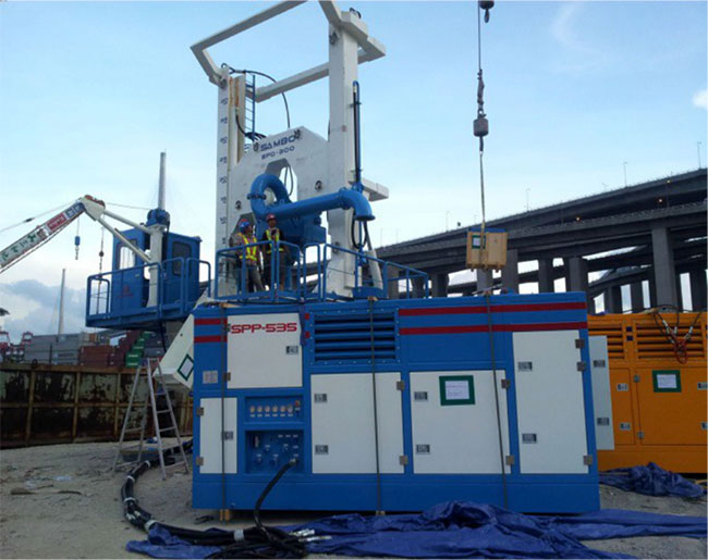講座最后,景安重工董事長(zhǎng)陳衛(wèi)先生對(duì)景安JRD(氣舉反循環(huán))鉆機(jī)及其聯(lián)合全回轉(zhuǎn)施工工藝進(jìn)行了詳細(xì)介紹與講解。他指出,JRD反循環(huán)鉆機(jī)是一套以全液壓控制的嵌巖鉆機(jī),利用液壓旋轉(zhuǎn)動(dòng)力頭提供足夠的扭矩及旋轉(zhuǎn)速度,再加上鉆具自重及加壓液壓油缸的下壓力,通過(guò)鉆頭上滾刀對(duì)巖面進(jìn)行位移與壓破,從而達(dá)到嵌巖的效果。該鉆機(jī)及相關(guān)工法已在福建、香港、澳門(mén)等地區(qū)的重點(diǎn)工程中“大顯身手”,為復(fù)雜地層的嵌巖施工提供了極佳的方案,獲得合作方一致好評(píng)。