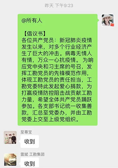 倡議一經(jīng)發(fā)出,工勘集團(tuán)黨委委員及各支部書(shū)記第一時(shí)間發(fā)揮“頭雁”作用,帶頭捐款,廣大黨員積極響應(yīng),入黨積極分子和群眾也紛紛表示要向黨員學(xué)習(xí),為防疫工作貢獻(xiàn)出自己的一份力量。眾志成城齊戰(zhàn)“疫”,短短兩個(gè)小時(shí),集團(tuán)黨委就收集到愛(ài)心捐款38700元,用涓涓細(xì)流匯聚成齊心戰(zhàn)“疫”的愛(ài)心暖流。