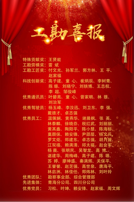 工勘巖土集團勘察事業(yè)部、綜合管理部榮獲“優(yōu)秀團隊”;青海分公司、四川分公司榮獲“先進集體”;溫佩嫻等44名員工榮獲“優(yōu)秀員工”;葉碧亮等5名員工榮獲“優(yōu)秀通訊員”;楊玉峰等5名員工榮獲“優(yōu)秀駕駛員”;高子建等10名員工榮獲“科技創(chuàng)新獎”;付文光等5名員工榮獲“工勘工匠獎”;雷斌榮獲“工勘勞模獎”;王賢能榮獲“特殊貢獻獎”;習(xí)松等5名黨員被評為“優(yōu)秀共產(chǎn)黨員”。集團高管為獲獎團體及個人頒發(fā)榮譽證書。